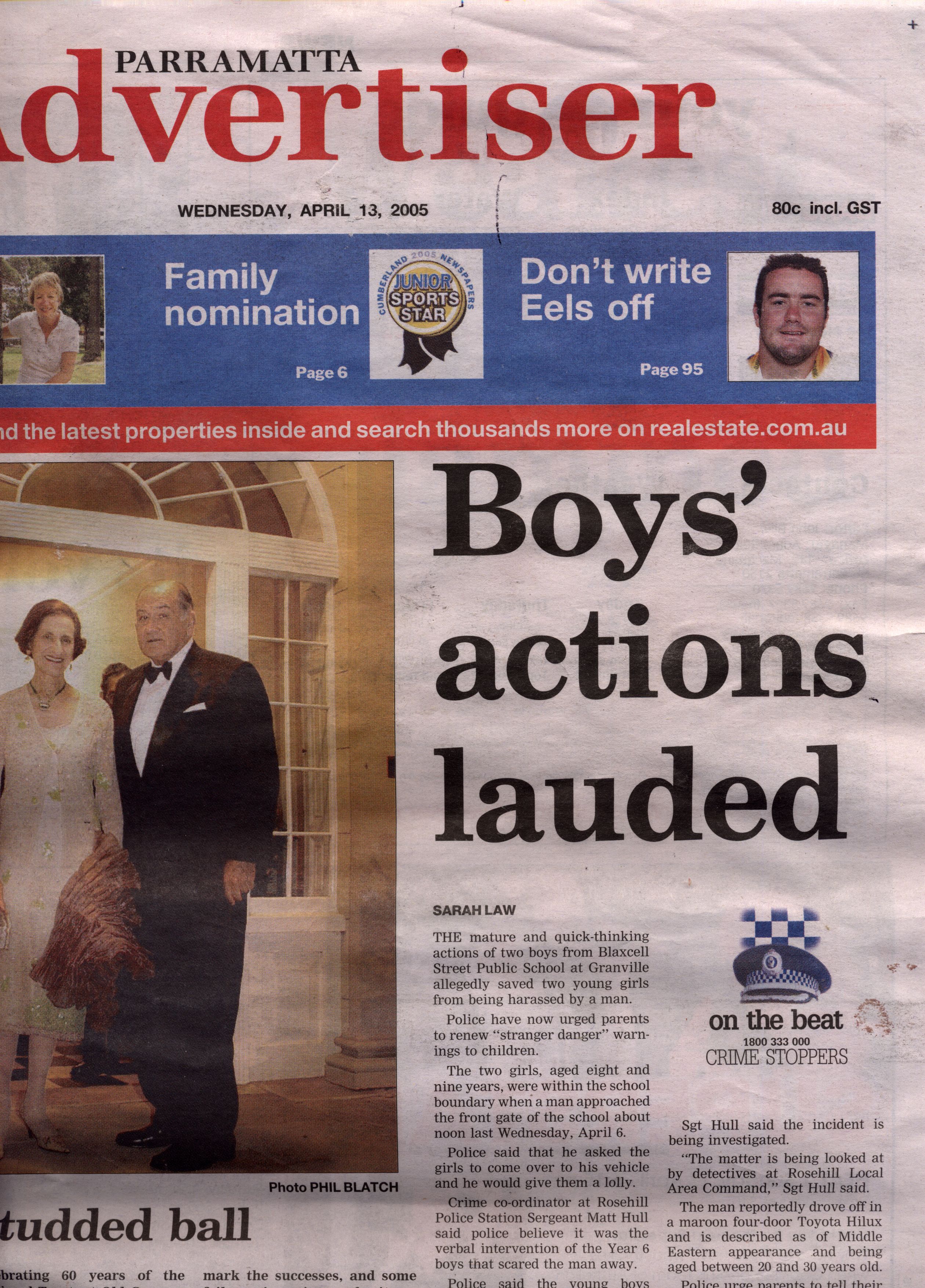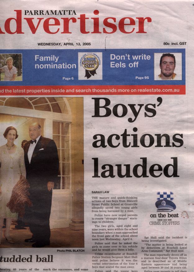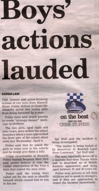 Our local paper, the Parramatta Advertiser, published an article on the front page on 13 April 2005. This article is relevant to parents and administrators at Blaxcell Street Public School. Note that the issue was also mentioned in the news program on the one of the TV channels close to the time that the incident happened, according to a parent who originally informed Nick of the matter.The text of the article is here: