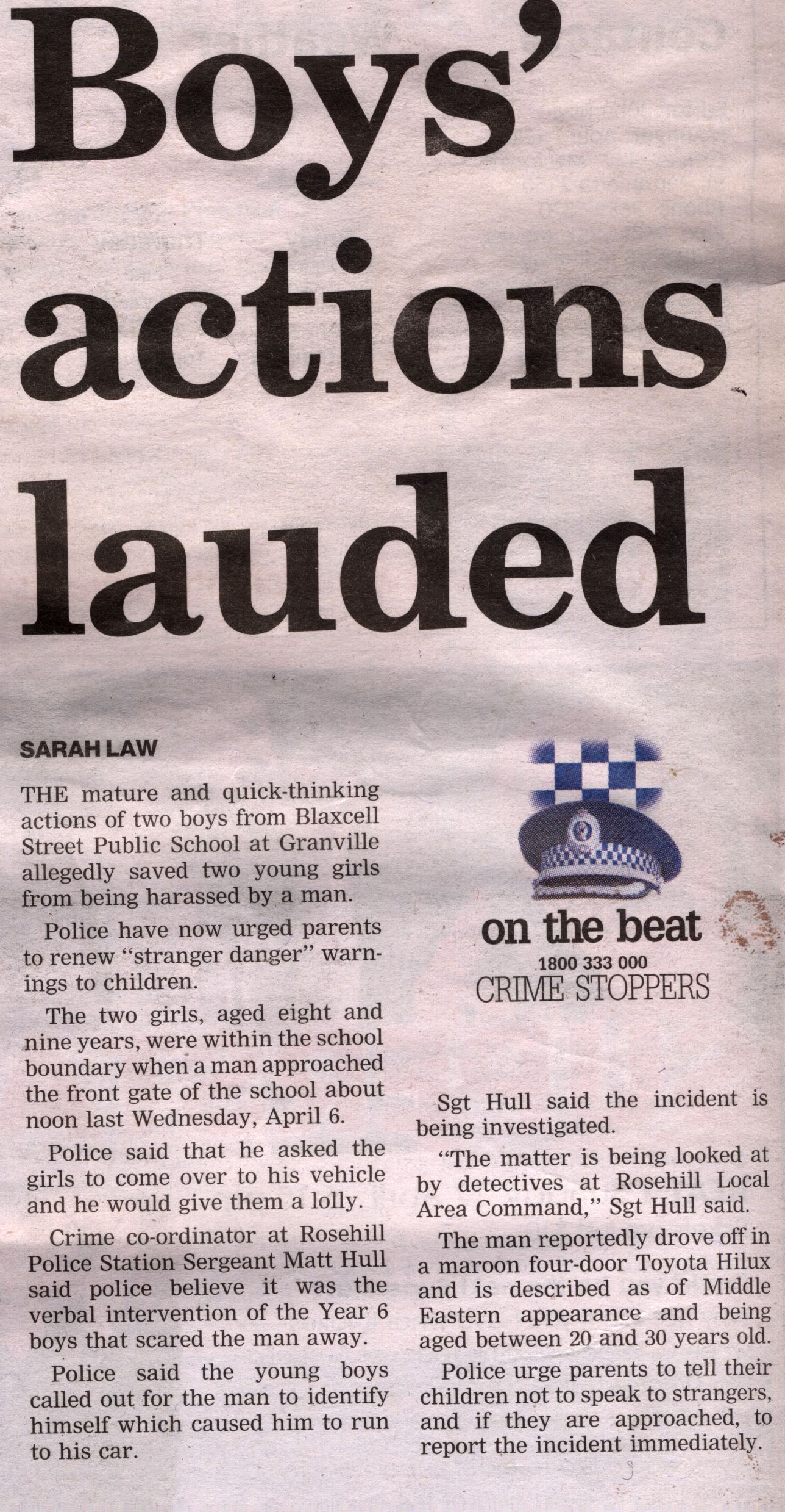 SARAH LAWTHE mature and quick-thinking actions of two boys from Blaxcell Street Public School at Granville allegedly saved two young girls from being harassed by a man.
